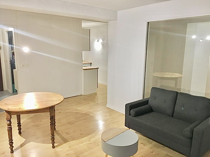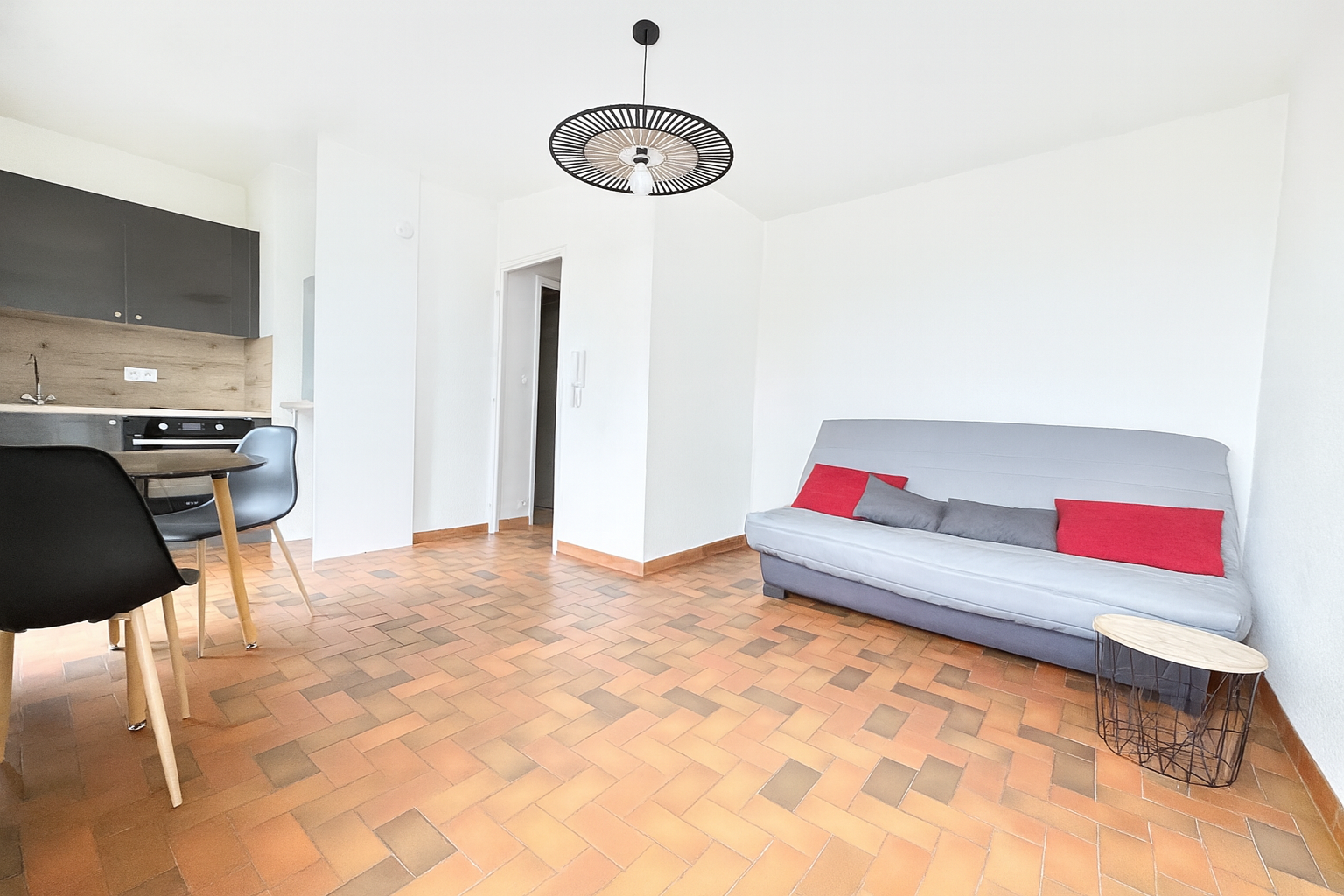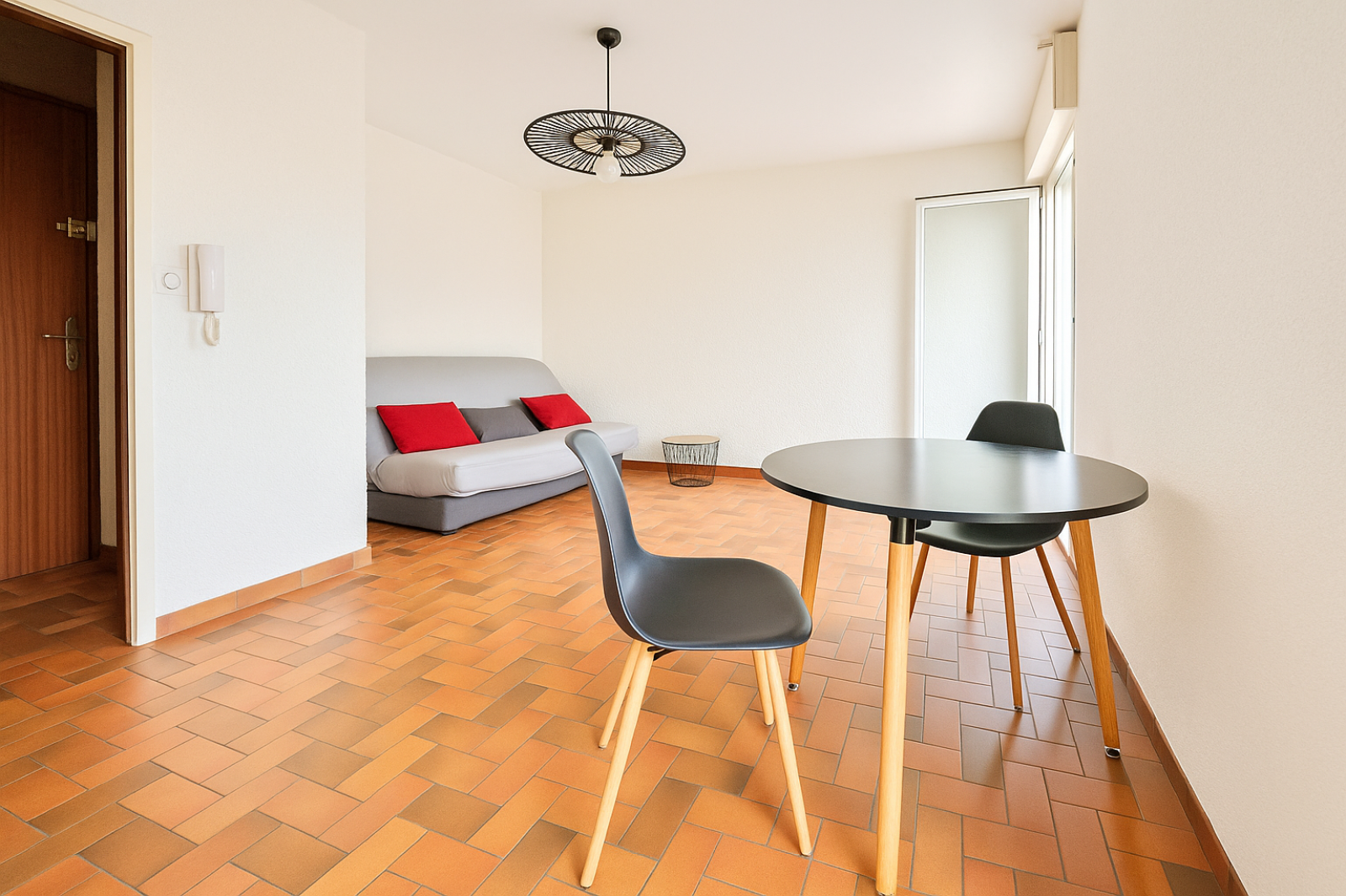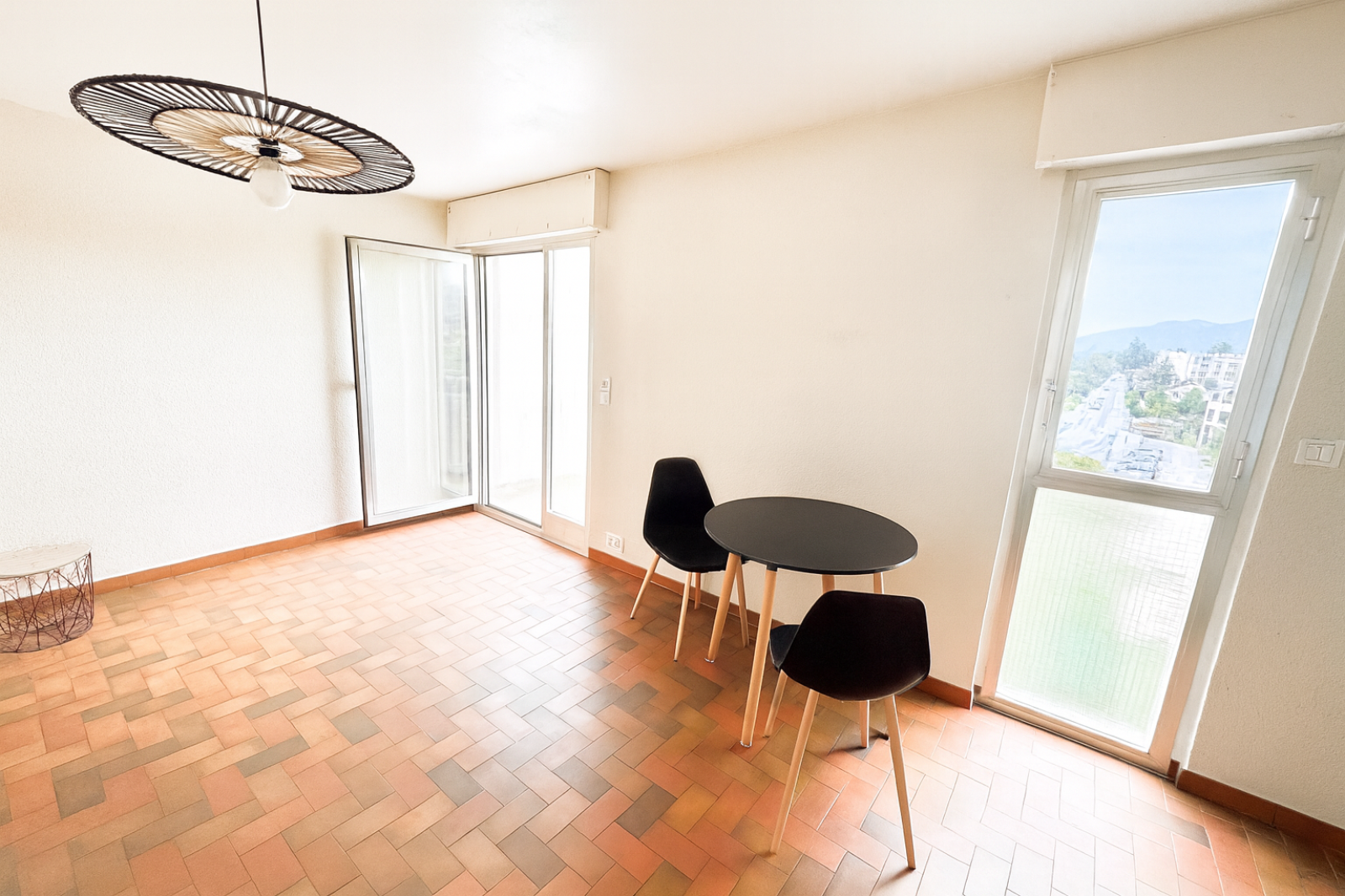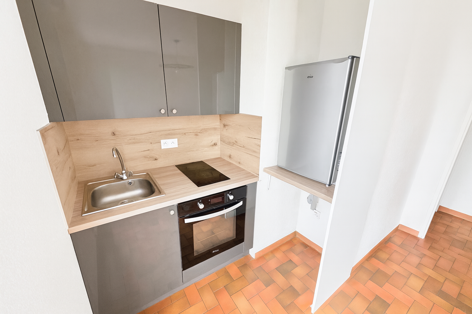 L’appartement se compose d’une pièce de vie lumineuse offrant un agencement fonctionnel. L’espace principal accueille un coin salon et un espace repas, tandis que la kitchenette, récemment aménagée, dispose de tout le nécessaire pour un usage quotidien : plaques de cuisson, rangements, évier et plan de travail.