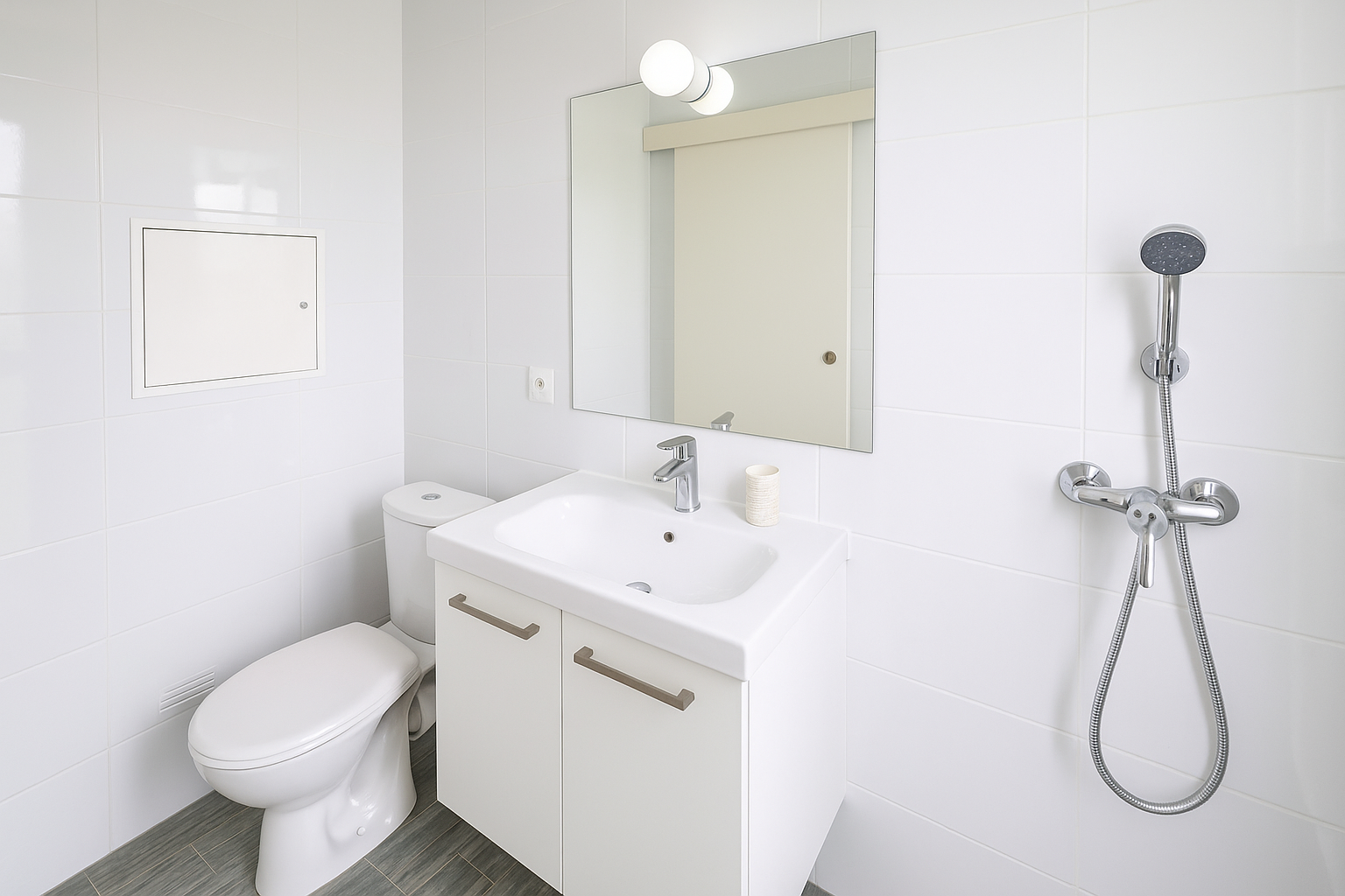 La salle d’eau, entièrement carrelée, comprend une douche, un meuble vasque avec rangements, un grand miroir et des WC. Elle a été rénovée avec des matériaux simples et fonctionnels, assurant confort et praticité au quotidien.