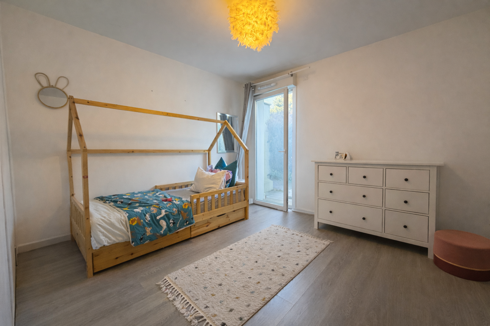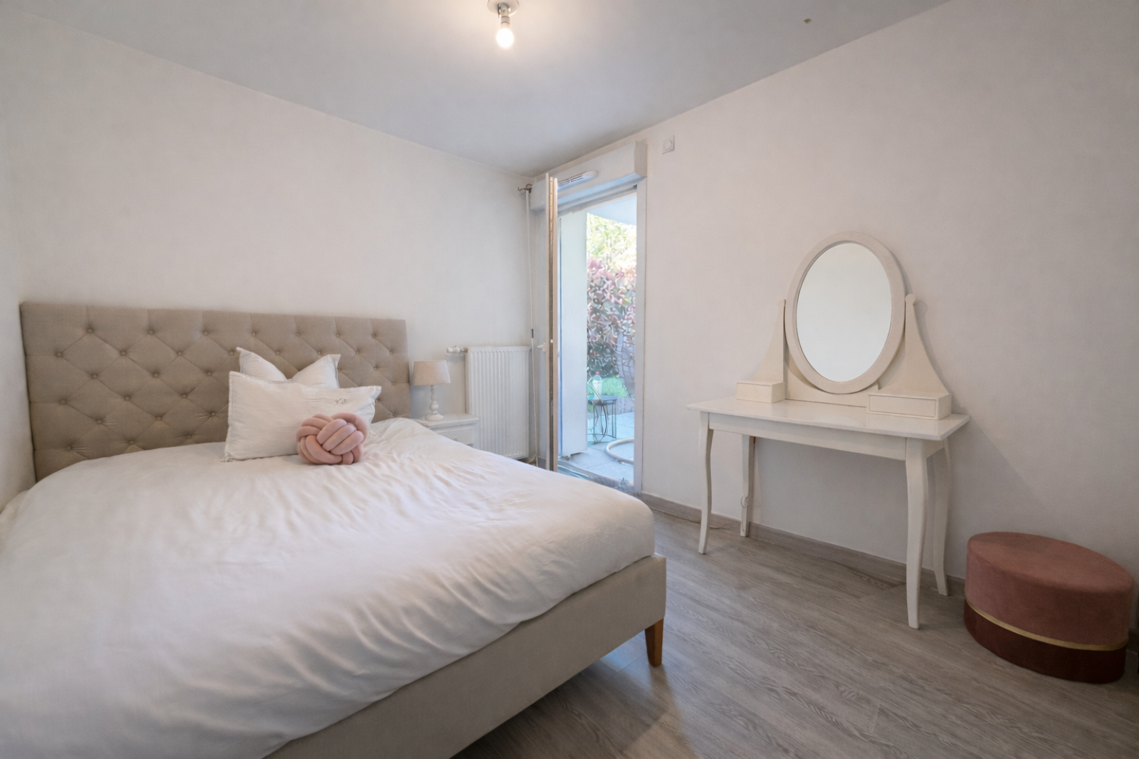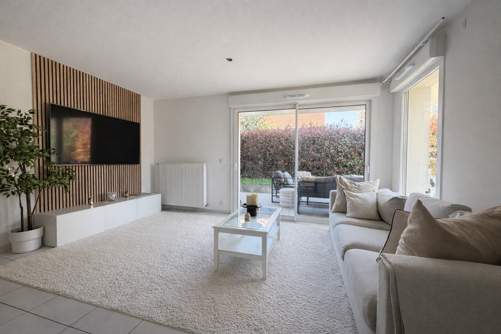 Dès l’entrée, vous découvrez un hall fonctionnel desservant une cuisine entièrement équipée et aménagée, ouverte sur une pièce de vie et sa terrasse. L’ensemble offre un accès direct à un superbe jardin privatif d’environ 100 m², idéal pour profiter des beaux jours en toute tranquillité.