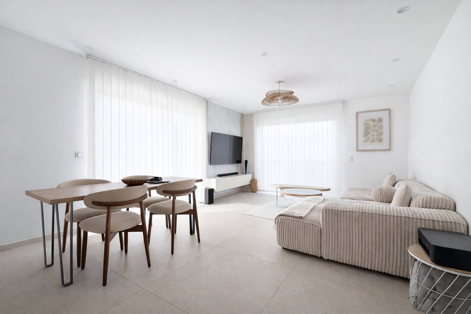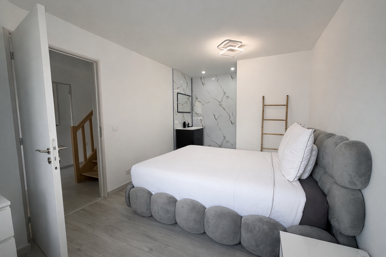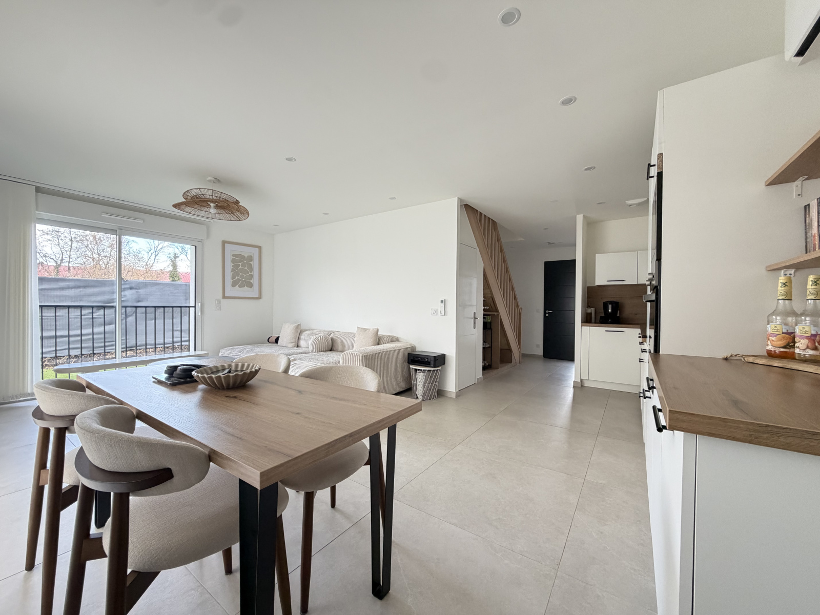 Elle se compose au rez-de-chaussée d’une pièce de vie lumineuse avec cuisine moderne entièrement équipée, ainsi que d’une chambre avec salle d’eau, idéale en suite parentale ou espace invités.