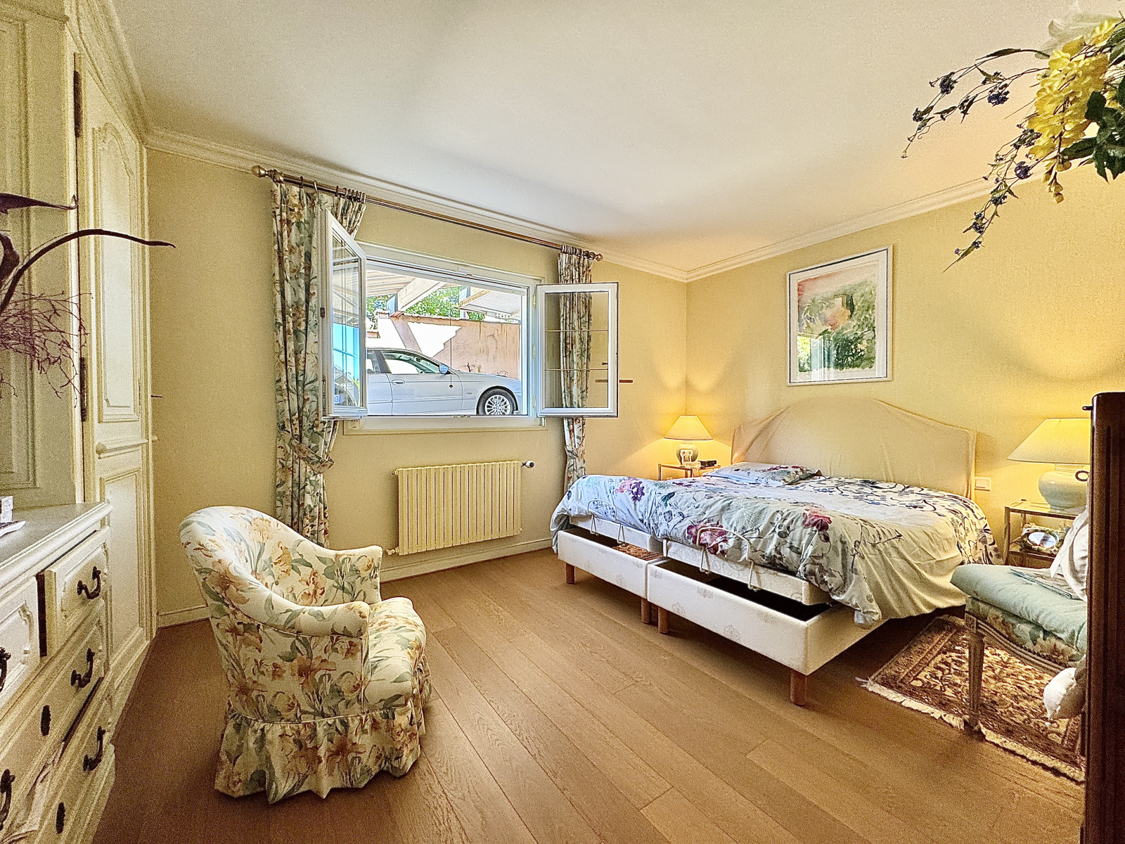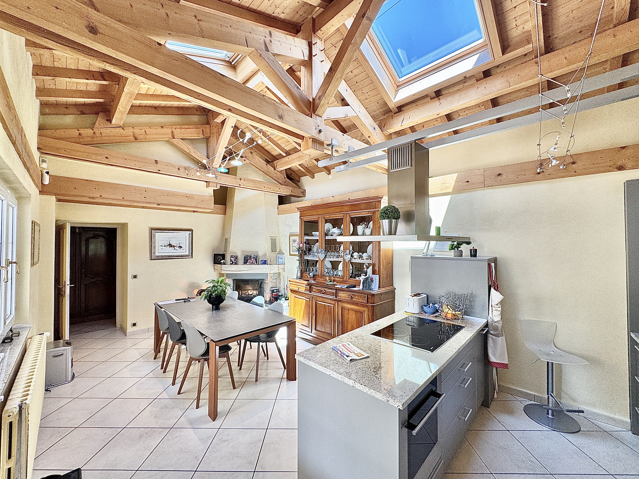 - Au rez-de-chaussée : • Grand double salon avec cheminée, baigné de lumière • Cuisine indépendante spacieuse, avec une belle hauteur sous plafond • Une chambre, salle de bain, WC séparé