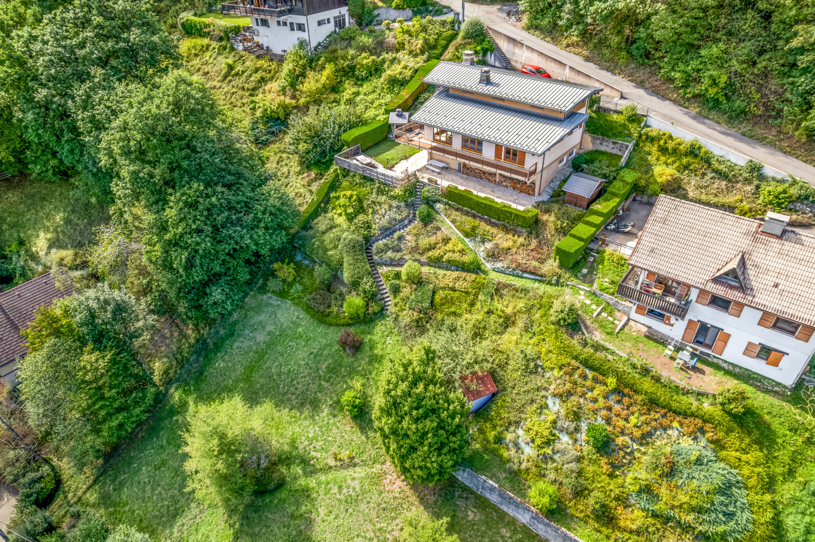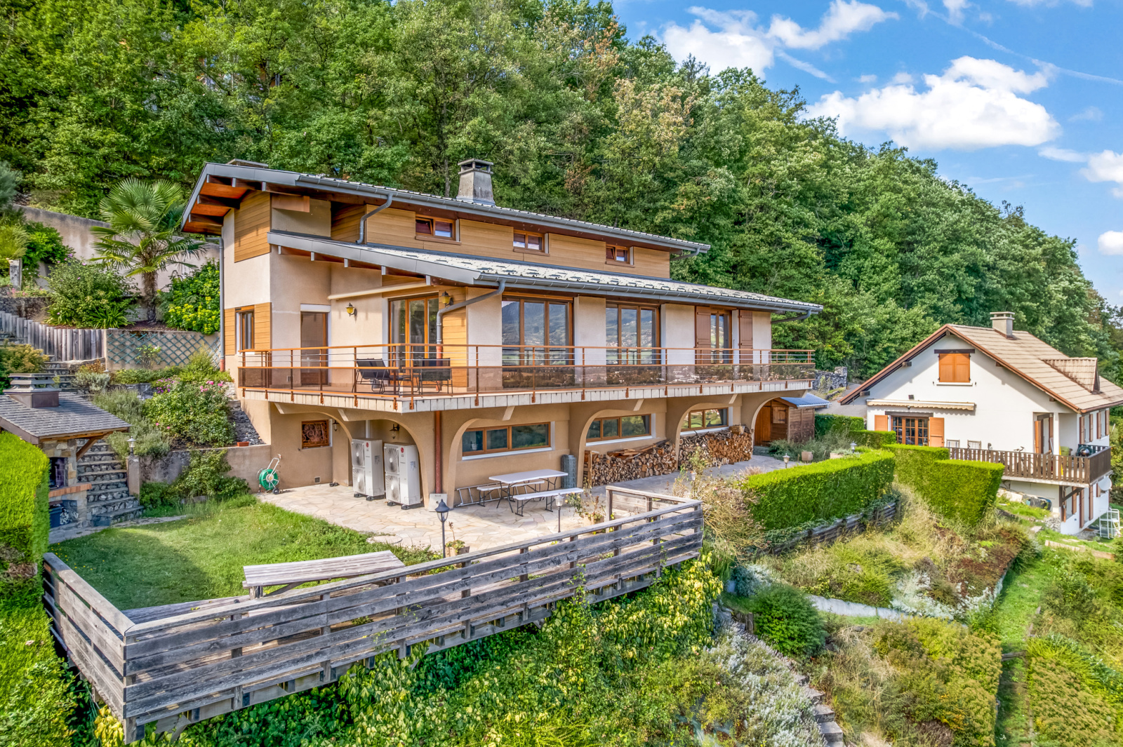 Édifiée sur un terrain de 1566 m², au bout d'une impasse, elle dispose d’un grand jardin arboré, de deux terrasses, deux abris de jardin et d'un coin barbecue permettant de profiter pleinement de la vue et de ce cadre pleinement naturel à chaque instant de la journée.