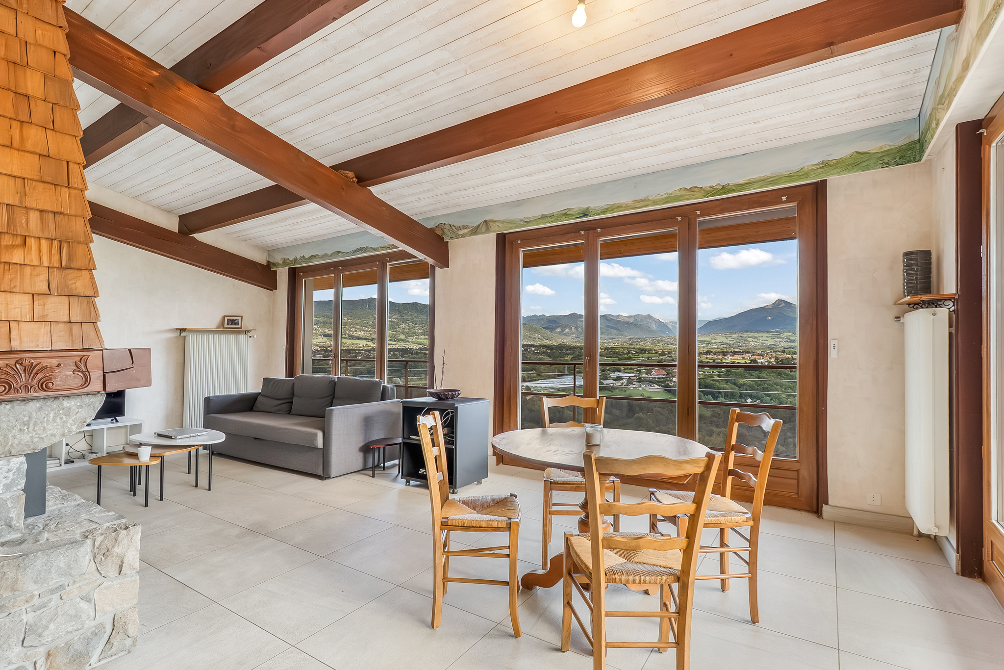 Au rez-de-chaussée, un hall d’entrée mène à une grande pièce de vie avec cheminée, baignée de lumière et offrant un accès direct à la terrasse avec vue dégagée sur les montagnes. Ce niveau comprend également une cuisine séparée avec cellier attenant, une suite parentale avec dressing et salle de bains, ainsi qu’un WC séparé.
