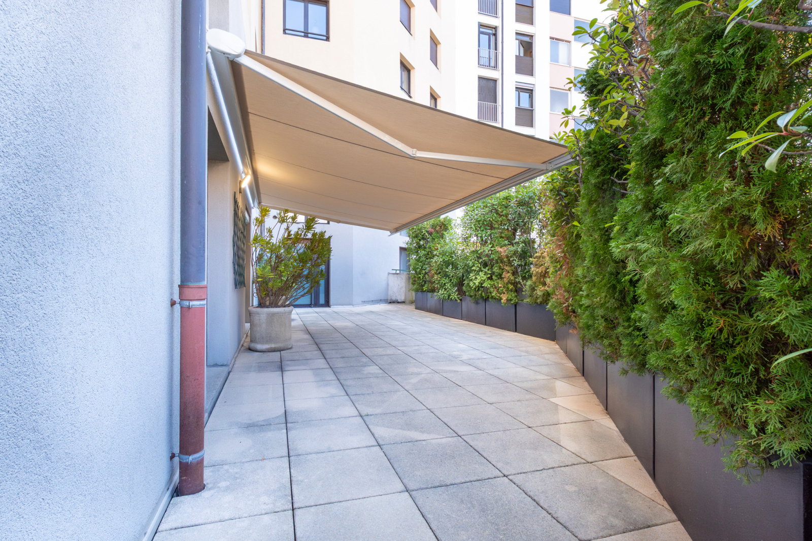 Au rez-de-chaussée, un hall d'entrée avec rangements dessert un vaste salon lumineux avec plus de 4 mètres d'hauteur sous plafond, et une cuisine entièrement équipée.Ce niveau comprend également une chambre avec salle de douche attenante ainsi qu'un WC indépendant avec lave-mains.La Terrasse, qui fait le tour complet du duplex, offre un espace extérieur exceptionnel accessible depuis le salon et la chambre, idéal pour profiter pleinement des beaux jours. À l'étage, l'espace de nuit se compose d'une chambre principale avec dressing, d'une seconde chambre spacieuse avec rangements dans le couloir, et une salle de bains principale avec douche et WC. Possibilité d'achat d'un garage privatif pouvant accueillir jusqu'à quatre véhicules, un véritable atout sur le secteur.