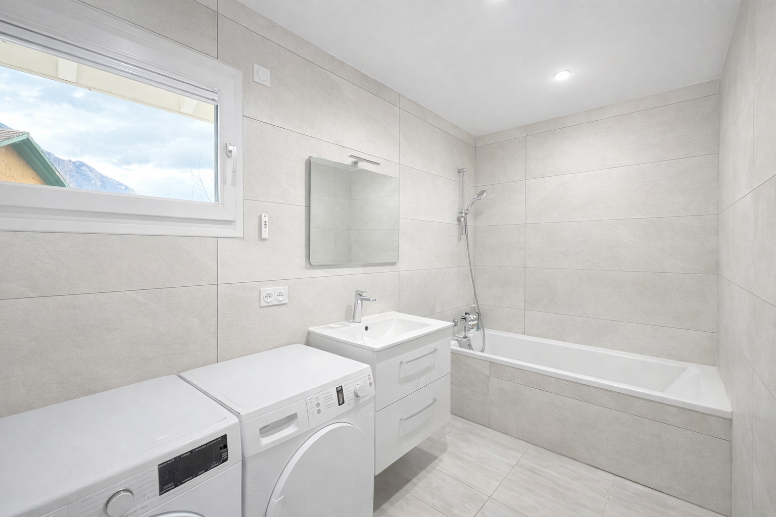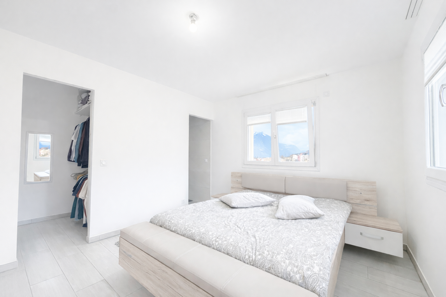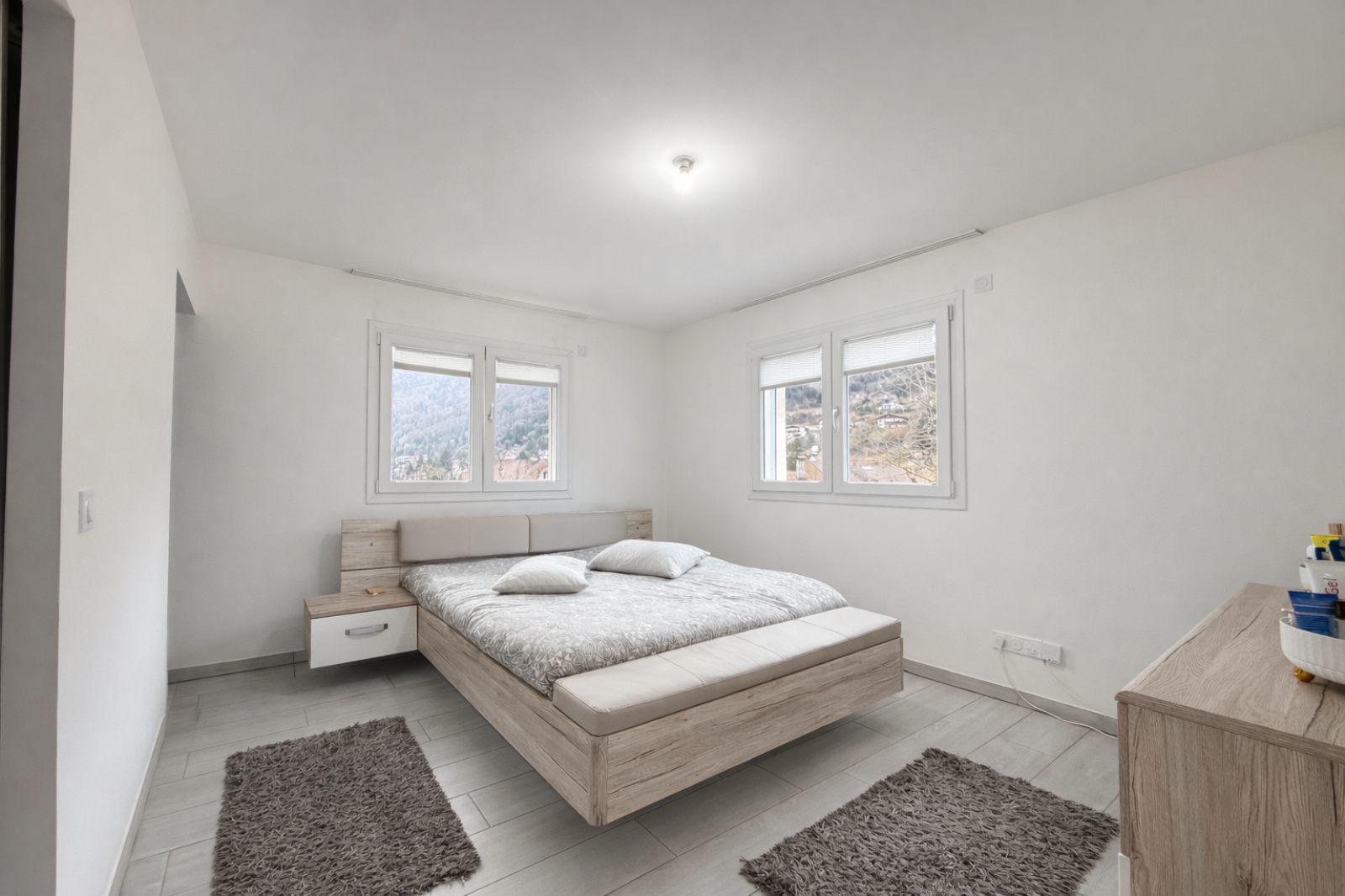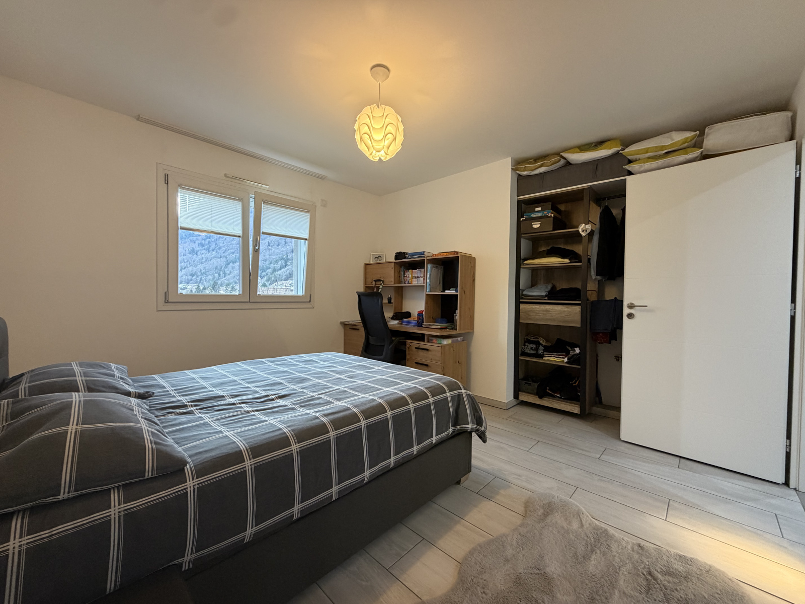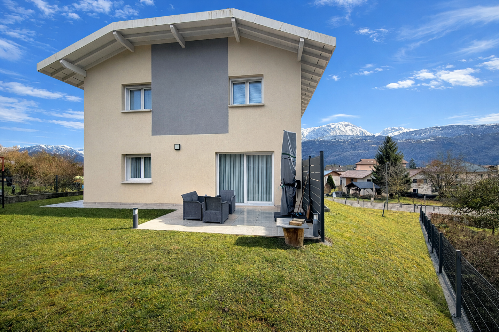 À l’extérieur, vous profiterez d’un jardin spacieux avec une belle vue dégagée sur les montagnes, idéal pour les moments en famille.