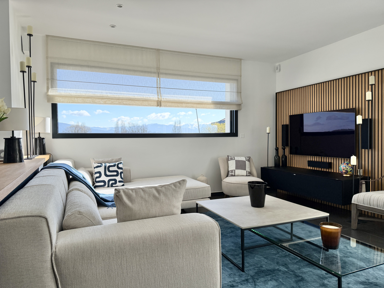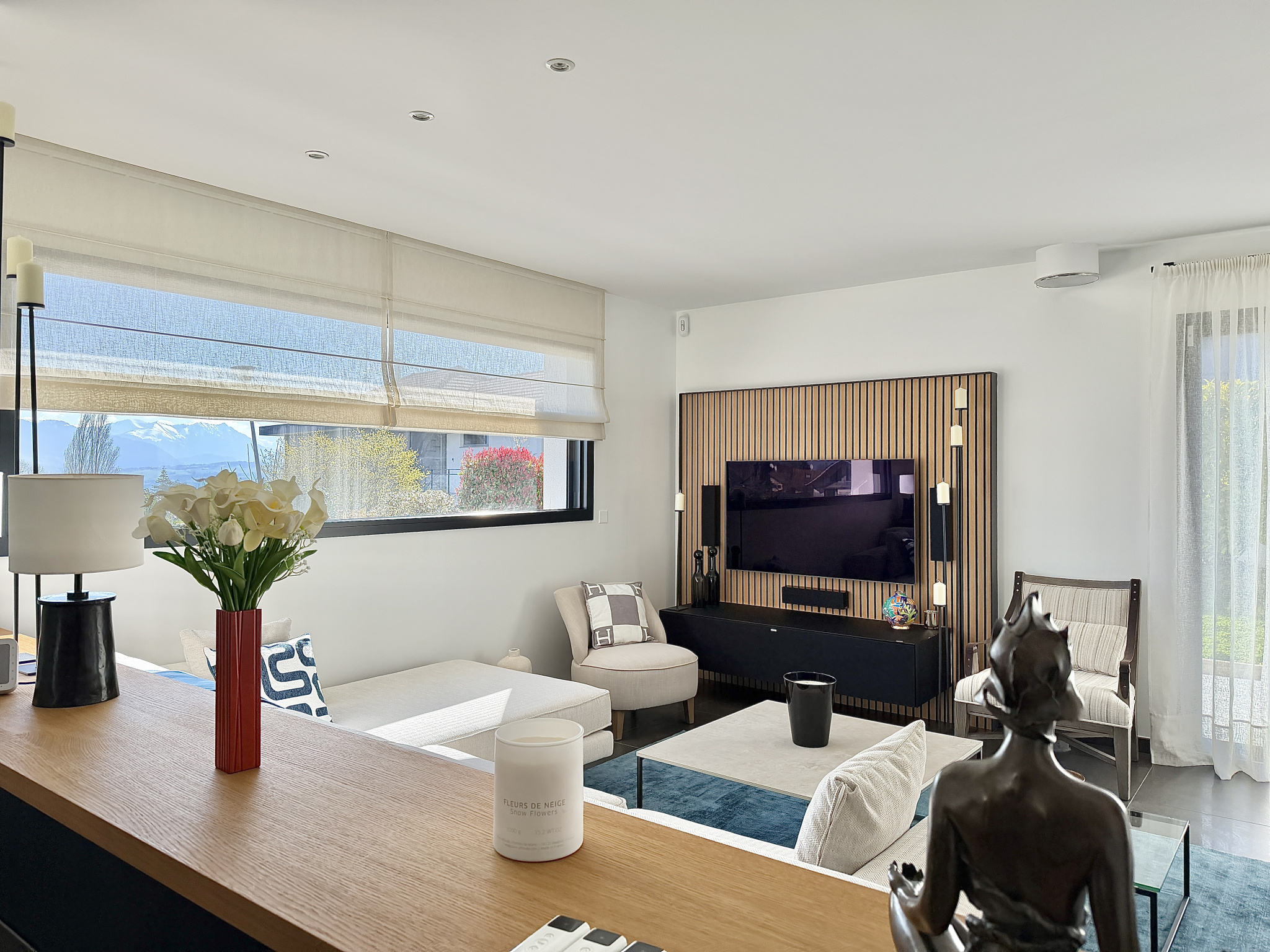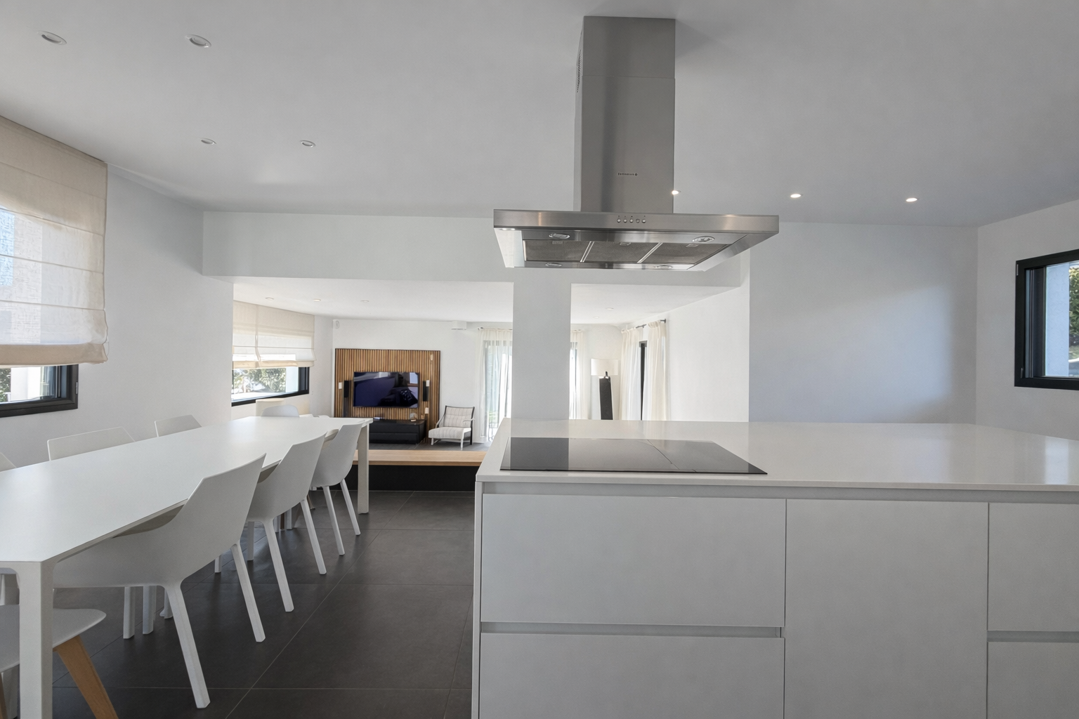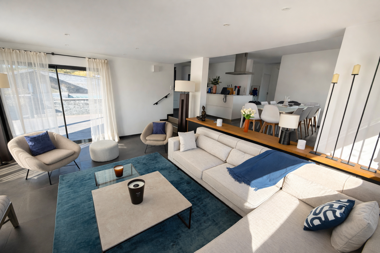 - Une cuisine moderne entièrement équipée ouverte sur un double salon lumineux
