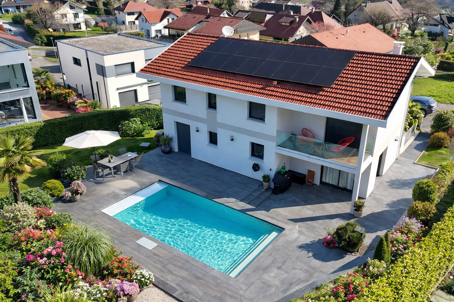 Implantée sur une parcelle agréable, la villa bénéficie d’un extérieur soigné et facile d’entretien :