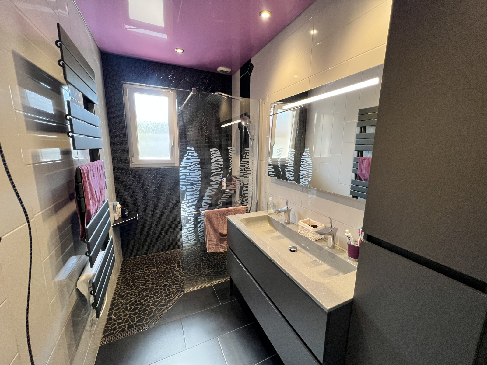 La maison offre également trois chambres confortables, une salle de douche moderne, un espace bureau idéal, ainsi qu’un garage complet.