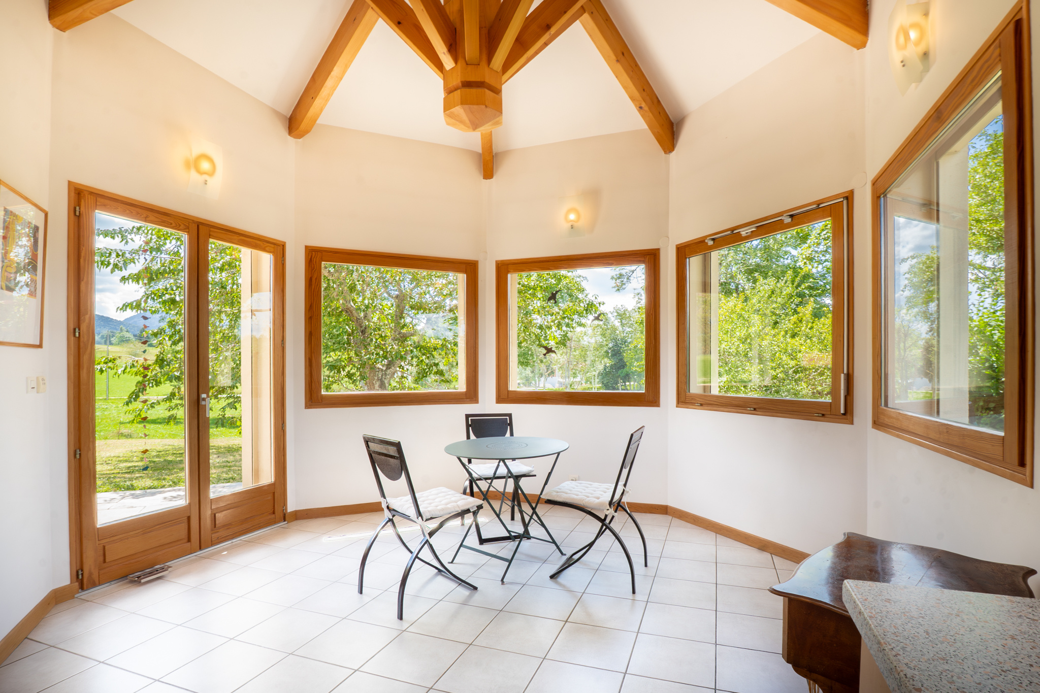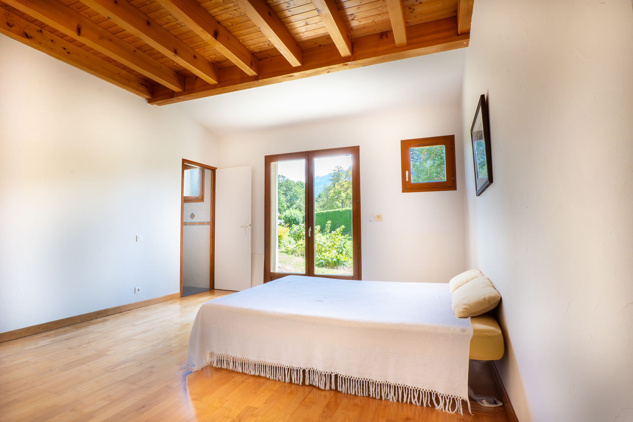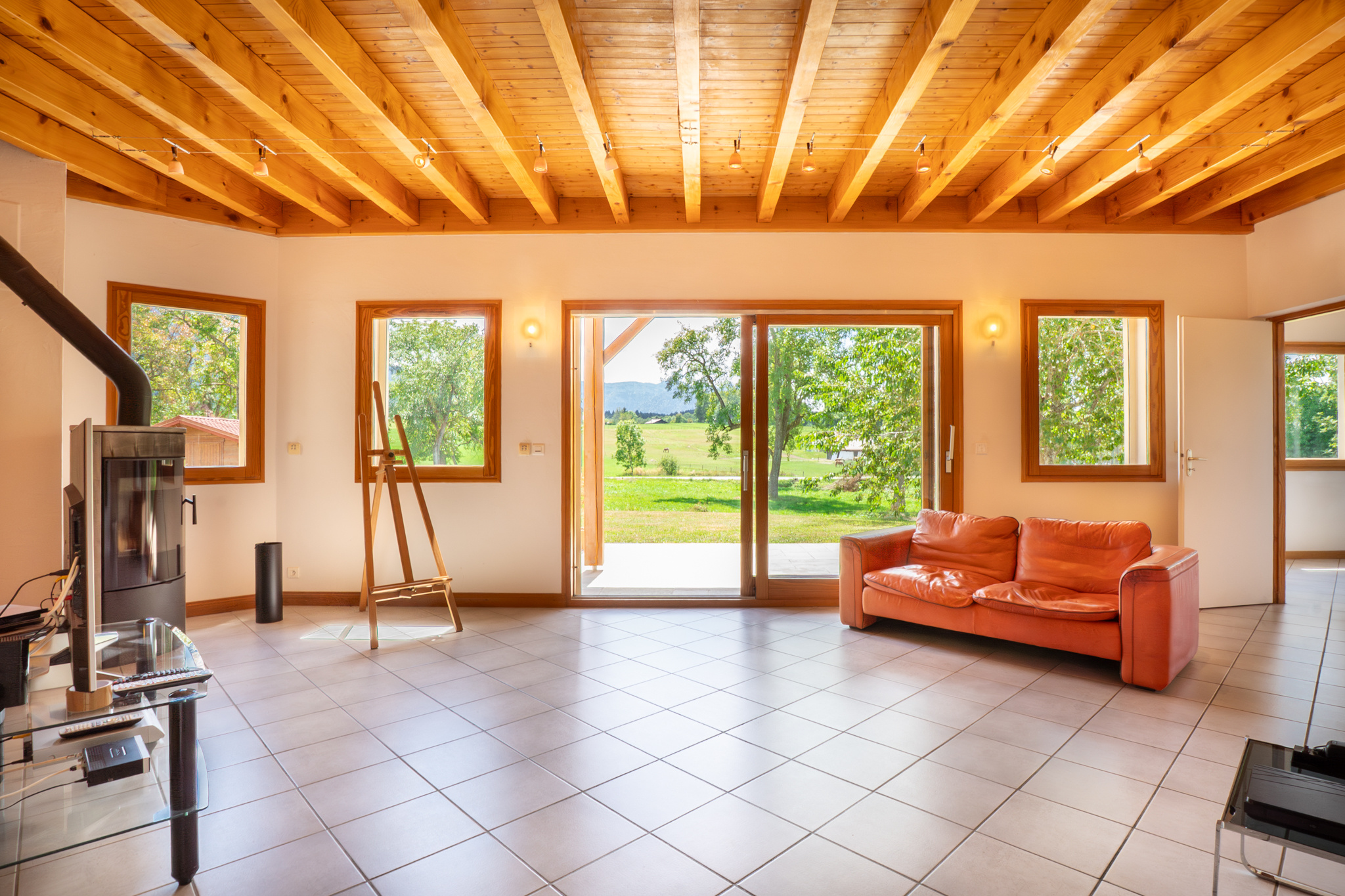 Le rez-de-chaussée se compose d’une cuisine séparée et équipée, d’un séjour lumineux de 25,90 m² agrémenté d’un poêle à bois, ainsi que de deux chambres dont une suite avec salle de douche. Un demi-niveau accueille une salle de bains familiale, tandis que le premier étage propose trois chambres supplémentaires.