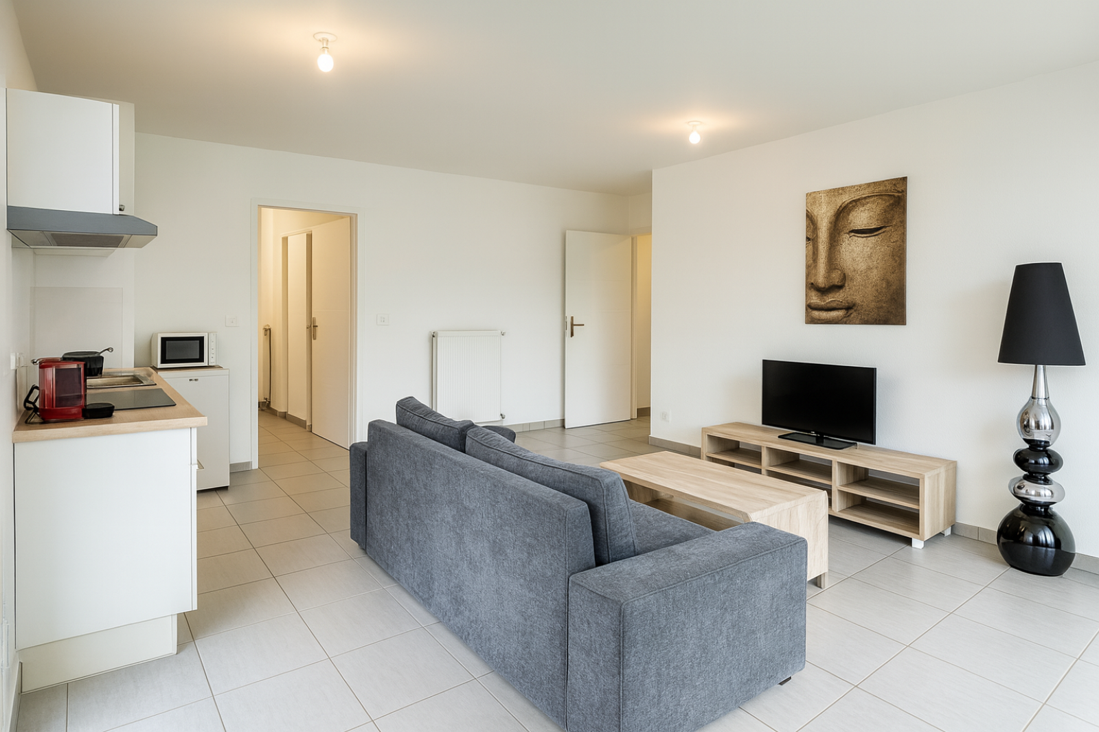 - Un grand salon lumineux ouvert sur une cuisine fonctionnelle, avec accès direct à la terrasse et au petit jardin privatif, parfait pour profiter des beaux jours.