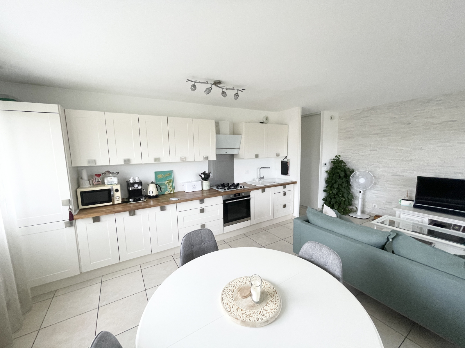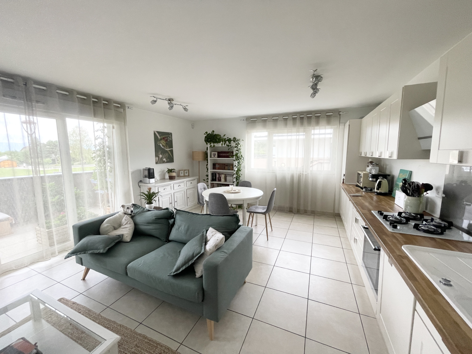 Cranves Sales, dans résidence récente de qualité, appartement contemporain de type 4 offrant hall d'entrée desservant cuisine équipée ouverte sur espace de vie avec accès terrasse, coin nuit disposant de 3 chambres avec placards, salle de bains, wc séparé , cellier et buanderie