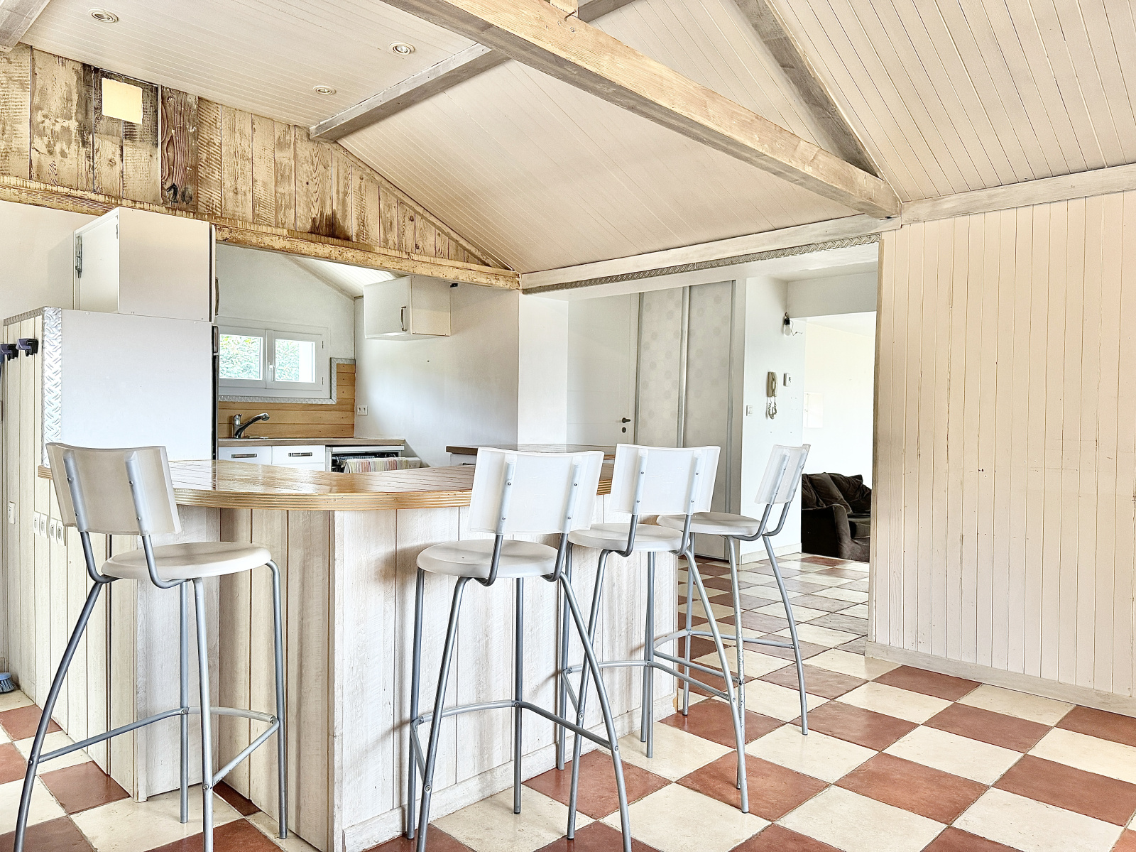 Au rez-de-chaussée : Un hall d'entrée desservant une cuisine américaine équipée ouverte de 27m2 sur un séjour et une salle à manger de 48m2 avec accès terrasse et jardin ainsi qu'une salle d'eau et wc.